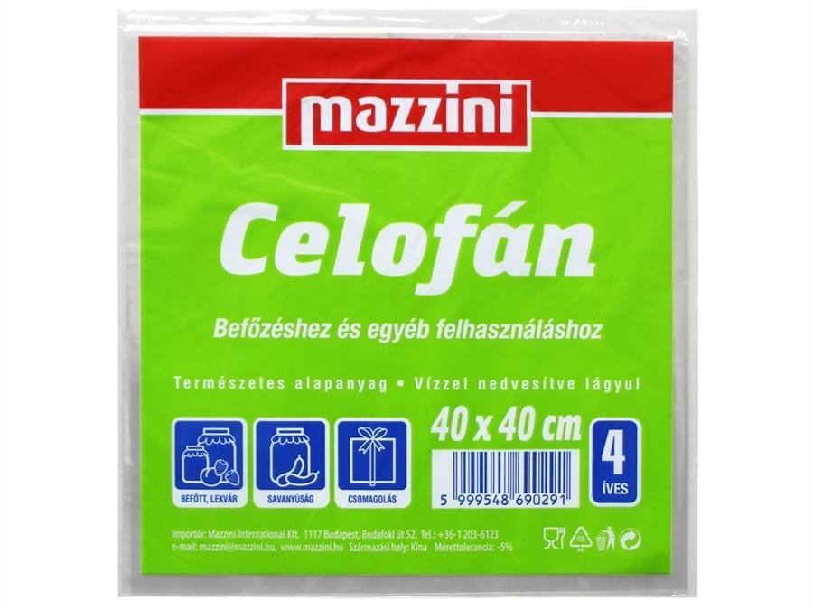 MAZZINI Celofán 4 ív 40x40 cm. Ideális befőzéshez és csomagoláshoz. Cellulóz alapú, víztisztán átlátszó természetes alapanyag. A befőző fóliával ellentétben hőre nem lágyul, viszont hajszálcsövessége révén vízzel érintkezve igen. Tehát a Celofán vízbe téve/áztatva válik lággyá és felhasználhatóvá, míg a műanyag Befőzési fólia vízre nem reagál, vízlepergető. A Celofán feldarabolás nélküli íve lehetőséget ad a szükséges, illetve tetszőleges méret kivágására, levágására. Nagyobb üveg lefedésénél érdemes duplázni a felhasznált Celofánt. Figyelni kell rá, hogy a tartósítás/eltevés során ne érintkezzen a befőző üveg tartalmával, páclevével, hogy megszáradva kifeszülhessen az üveg tetején. A Celofán 'lélegzik', ezért Celofánnal lezárt, hónapok során eltárolt befőtt, savanyúság, stb. üvege veszít a folyadék szintjéből, így a felszínre került kompót (őszibarack, körte, stb,) bebarnulhat a lekvár teteje pedig kiszáradhat. A termék higiénikus, és az egészségre ártalmatlan.