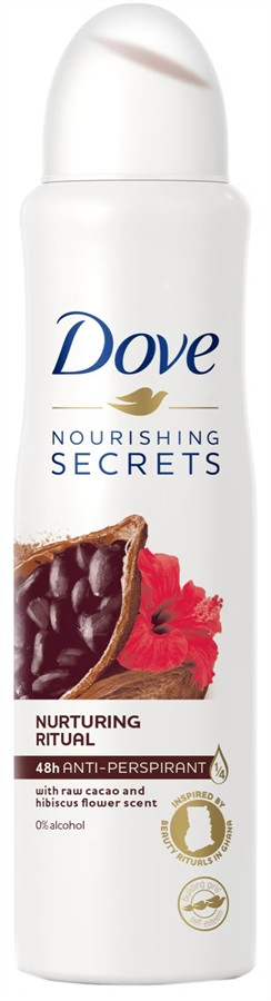 A ghánai nők szépségrituáléi ihlette Nourishing Secrets Nurturing Ritual izzadásgátló aeroszol a kakaó és a hibiszkusz illatával felébreszti érzékeidet és segít jobb kedvre deríteni. 1/4 rész hidratálókrémet tartalmaz és nem csak segít csökkenteni az izzadást, de ápolja is a hónaljadat, valamint segít puhává és simává tenni a bőrt. 48 órán át tartó megbízható védelmet nyújt, hogy kényelmesen és magabiztosan érezd magad.