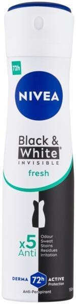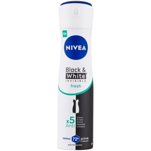 Nivea Black & White Invisible Fresh Női Deo Spray 150 ml – Hosszan Tartó Védelem Foltok Nélkül Nivea Black & White Invisible Fresh Női Deo Spray a tökéletes választás mindennapi használatra, ha frissességre és ruházatvédő hatásra vágyik. Speciális formulája segít megelőzni a fehér foltok kialakulását a fekete ruhákon, és a sárga foltokat a fehér ruhákon, így ruhái mindig kifogástalanul tiszták maradnak. A hosszantartó, 48 órás izzadásgátló hatás gondoskodik a frissességről, miközben gyengéd a bőrhöz, alkoholmentes összetételének köszönhetően. Termékjellemzők: