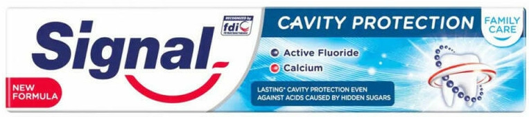 A Signal Family Care Cavity Protection fogkrém tartós fogszuvasodás elleni védelmet biztosít a család számára. Még az olyan ételek és italok is, mint a gabonapehely, a gyümölcsök és a joghurtok (melyekről nem is gondolnánk), magas cukortartalmúak lehetnek és fogszuvasodást okozhatnak. Az aktív fluoridot és kálciumot tartalmazó hatékony formula hosszan a fogmosás után is segít helyreállítani az apró, láthatatlan lyukakat a fogzománcon, melyeket a rejtett cukrokból képződő savak is okozhatnak. Hatékonyan segít erősíteni a fogzománcot a nap mint nap erős fogakért.